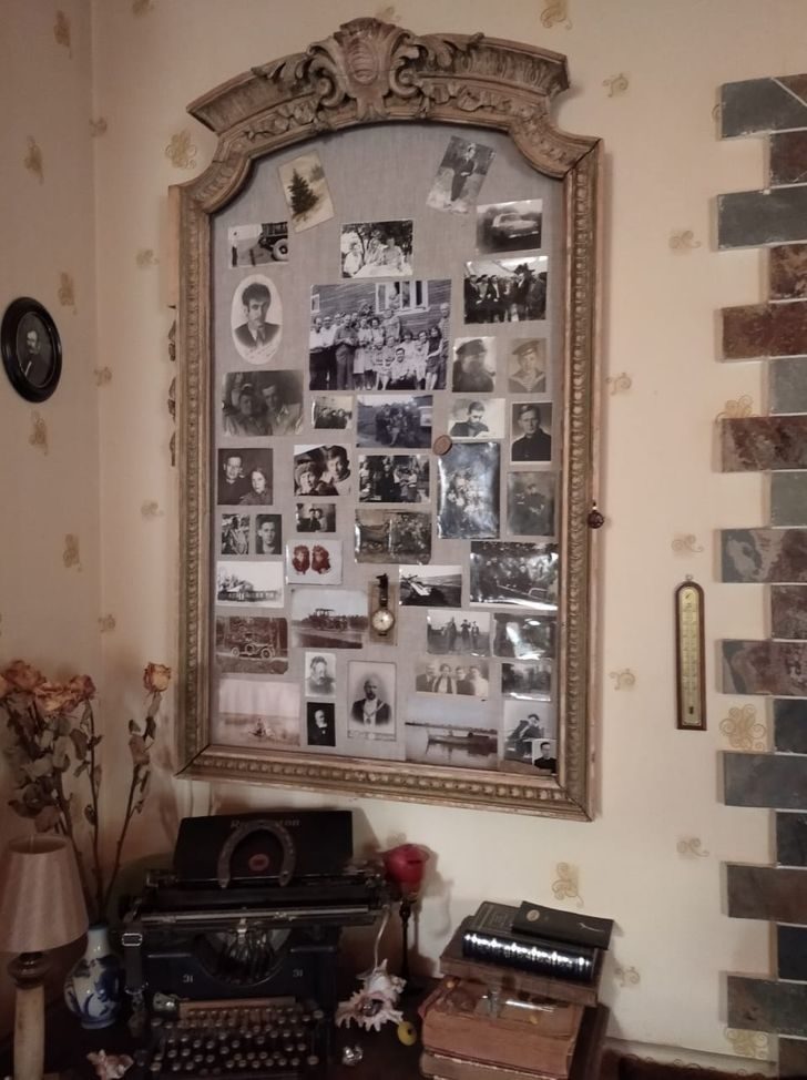 Если взять деревянную рамку от большого зеркала или купить подходящую пластиковую конструкцию в художественном магазине, то фотографии всех многочисленных родственников легко поместятся в едином пространстве.