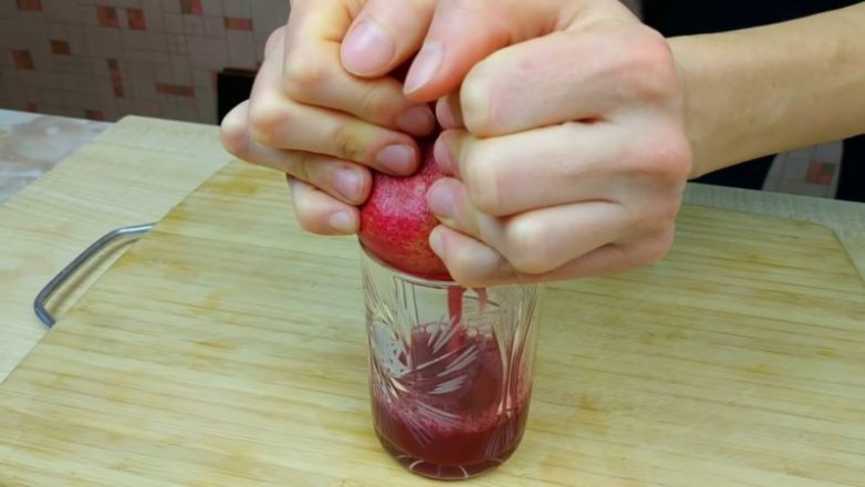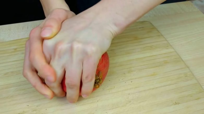 Прежде всего, нужно выбрать спелый гранат. Положить его ребром на ровную поверхность и, надавливая ладошкой сверху, катать в разные стороны. Будет слышен характерный хруст — продолжаем катать со всех сторон до тех пор, пока хруст не исчезнет.