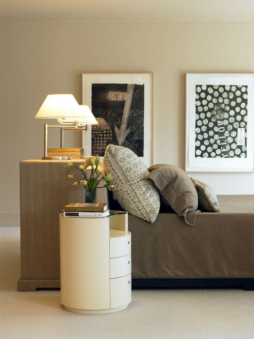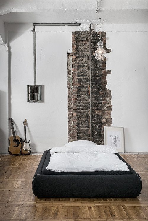 При этом многие пользователи Houzz часто не видят проблемы в кровати ногами в проход. Представим, что у вас пространство студийной планировки, и двери в комнату нет в принципе. Да что уж там — даже стена между спальней и смежной комнатой отсутствует, как в проекте на фото. Скорее всего, изголовье кровати неизбежно будет стоять к окну, а изножье — к двери.