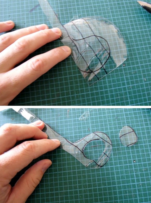 Приклейте шаблон к донышку и оберните бумажную полосу вокруг бутылки. Используя маркер сделайте на бутылке разметку.