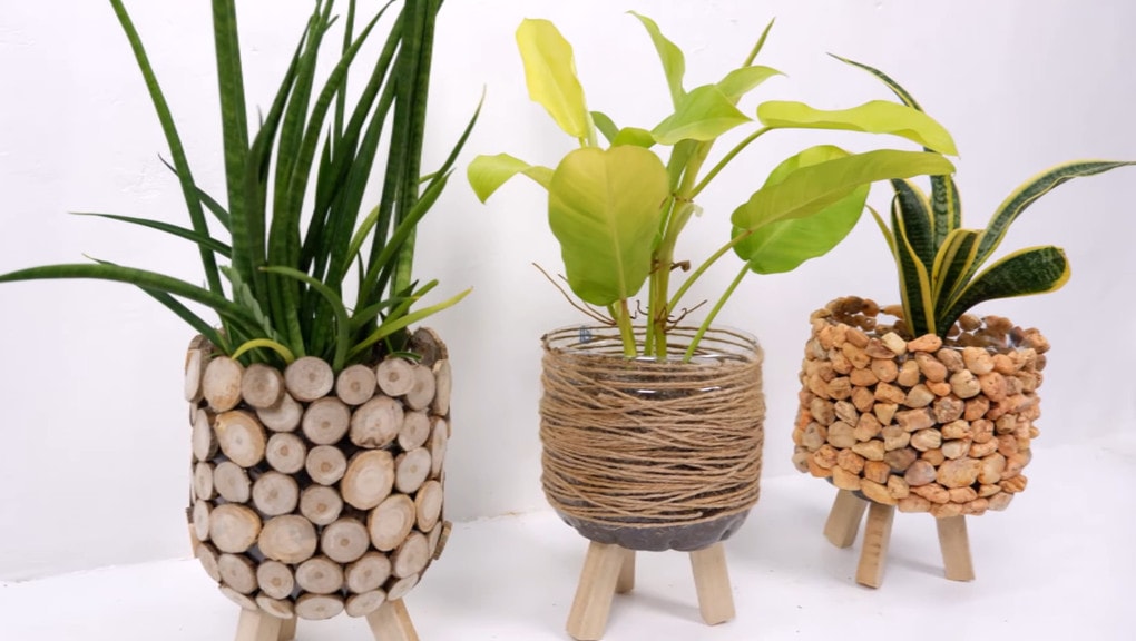 Для оформления трех горшков понадобятся 5-литровые бутылки, деревянные ножки и отделочный материал: толстая ветка, джутовый шпагат и камни.