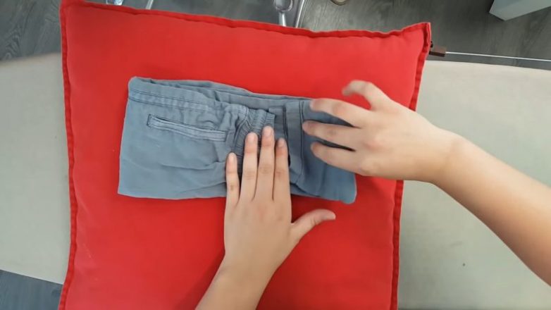 По схожему методу сложим джинсы/штаны. Кладём их сначала задней стороной вверх. Складываем, как показано на фото ниже.