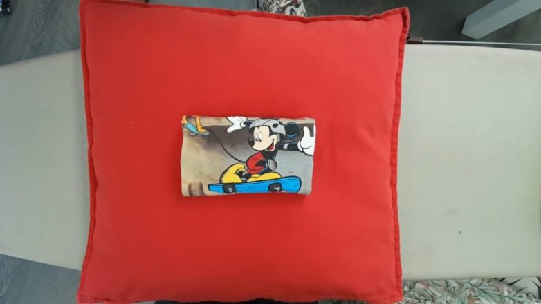 Поверх неё положите оставшуюся нижнюю часть. Здесь же есть небольшой «кармашек» из футболки. Выворачиваем его через футболку наверх.