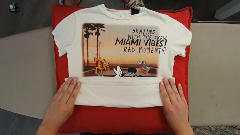 Затем переверните спиной вверх, лицевой стороной вниз. Сложите футболку книжкой. Теперь загните верхнюю часть в центр.