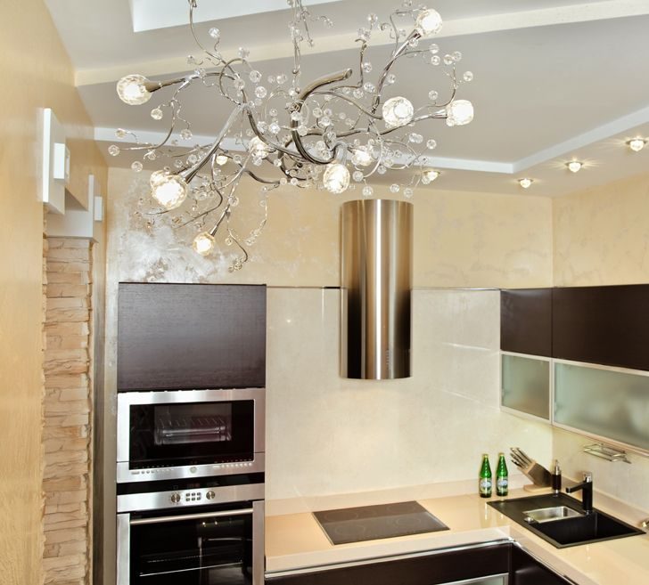 Многие до сих пор полагают, что объемная люстра с кучей висюлек вполне уместна на кухне и даже считается особым шиком. Но, как показывает практика, отмывать мелкие элементы осветительного прибора — это крайне непростое занятие. А ведь жирный налет вместе с пылью неминуемо осядет на люстре. И даже никакая мощная вытяжка не спасет.