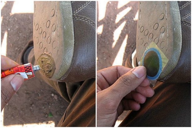 Если в подошве ботинок образовались трещины, и у вас промокают ноги, попробуйте использовать набор для ремонта велосипедной камеры, чтобы заклеить дыру в подошве.