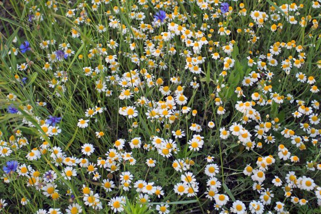 Растения для мавританского газона: мятлик луговой, овсяница красная, тимофеевка луговая, полевица тонкая, райграс пастбищный, мак, ромашка луговая, эшшольция, маргаритки, вероника, крокусы, рябчики и др.