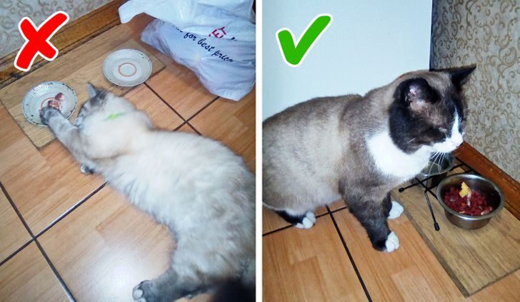 Мы считаем, что у каждого котика и собачки должны быть личные миски — такие, чтобы из них было сложно разбрасывать еду. Если уголок животного все равно усеян остатками трапезы, на помощь придут нескользящие коврики и специальные кормушки.