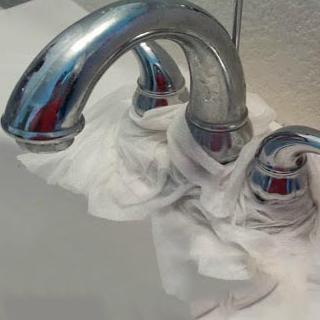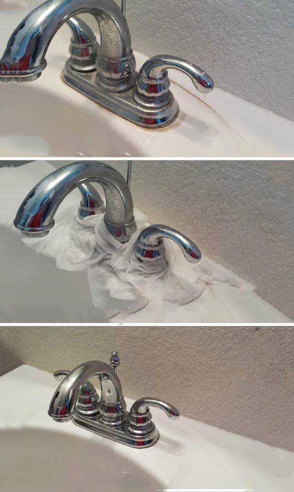 Смочите бумажные полотенца в уксусе и оставьте вокруг смесителя на 30-40 минут, после этого уберите их и смойте остатки уксуса водой — и смеситель будет как новенький