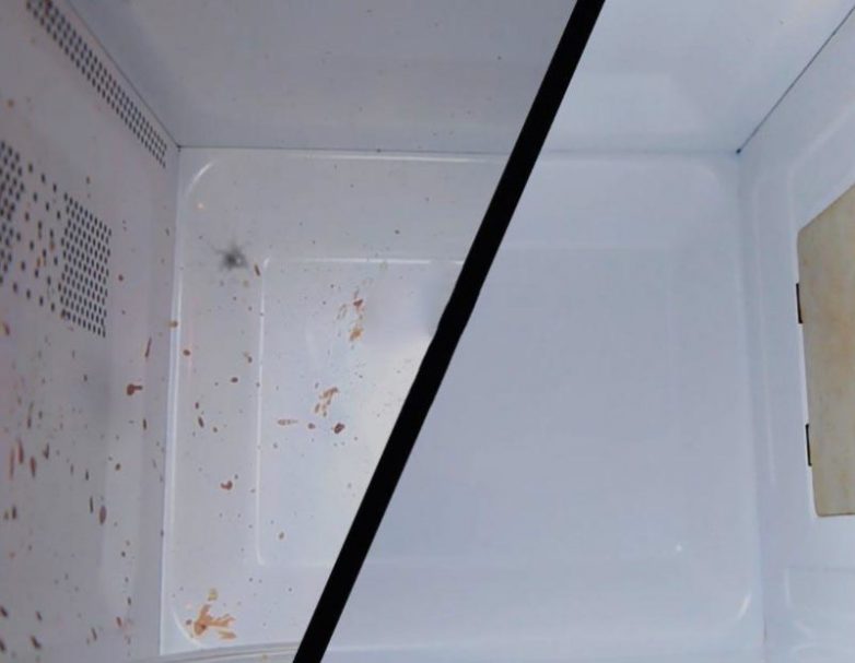 Поставьте миску с 1/2 стакана воды и соком + цедрой одного лимона в микроволновку на обычный режим на 3 минуты, затем оставьте ещё на 5 минут в закрытой микроволновке, после этого просто протрите загрязнения чистой губкой