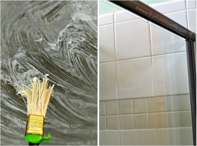 Жесткая щетка и средство для мытья окон справятся с сильным налётом на стекле душевой