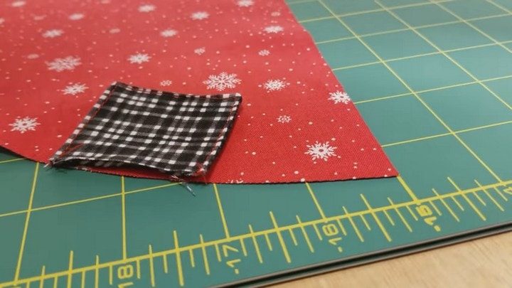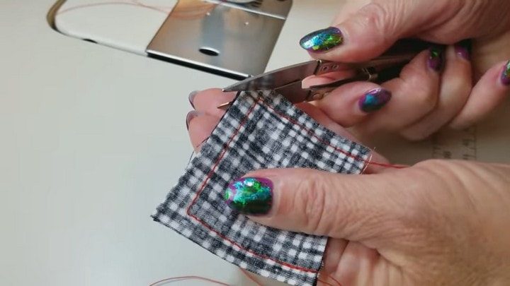 Вырежьте полукруг по разметке. Чтобы вырезать такую же фигуру на втором прямоугольнике, просто положите сверху одну из уже вырезанных заготовок. Полоску ткани для ствола нарежьте на кусочки по 5 см шириной. Получатся прямоугольники 6,5 на 5 см. Сложите детали ствола по две лицом друг к другу. Прошейте по трём сторонам, оставив незашитой одну из длинных сторон. Срежьте углы с припусков на швы близко к строчке.