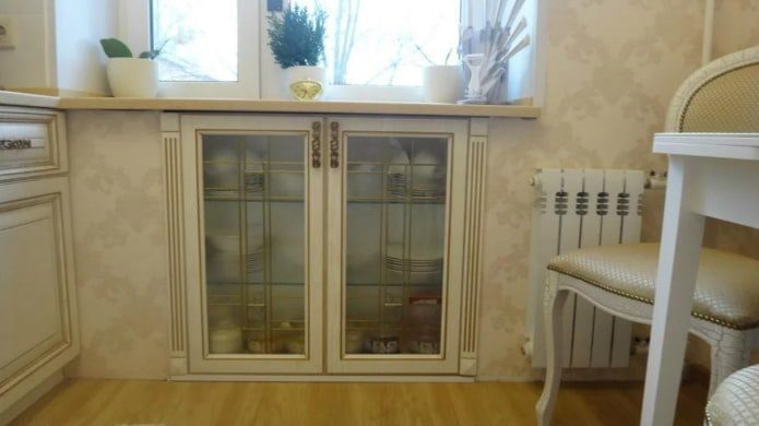 На самом же деле, под подоконником можно сделать вместительный шкаф, установить технику, в том числе и холодильник и даже сделать это место частью кухонного гарнитура.