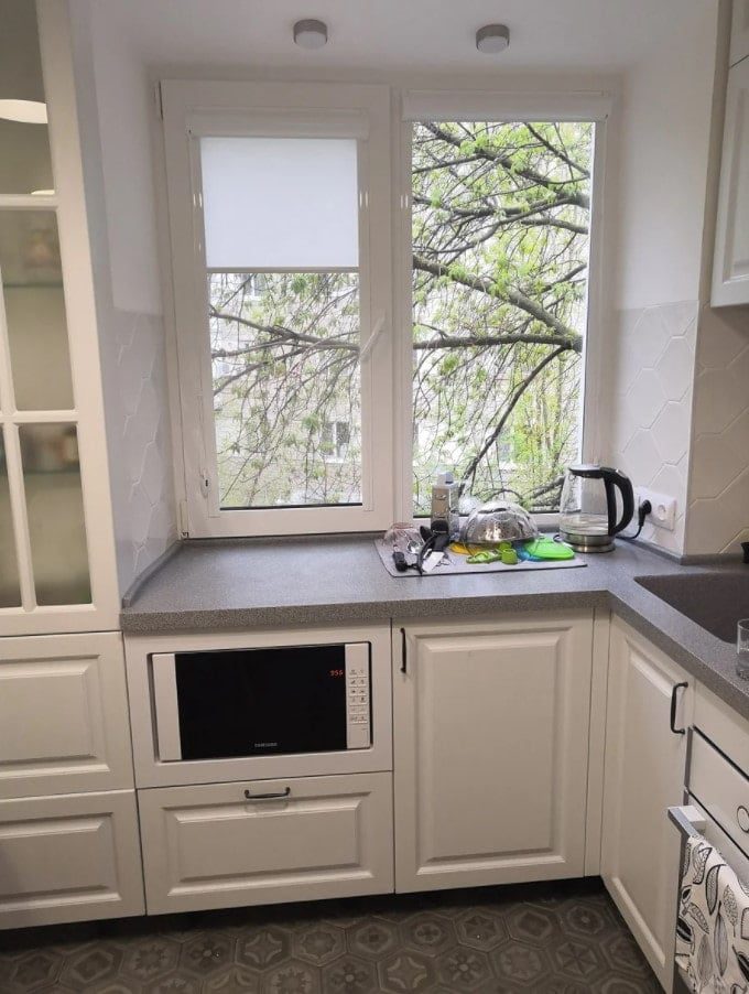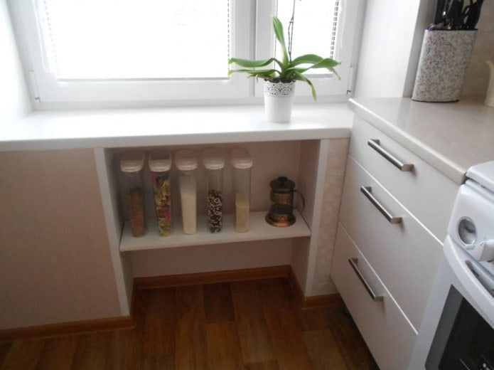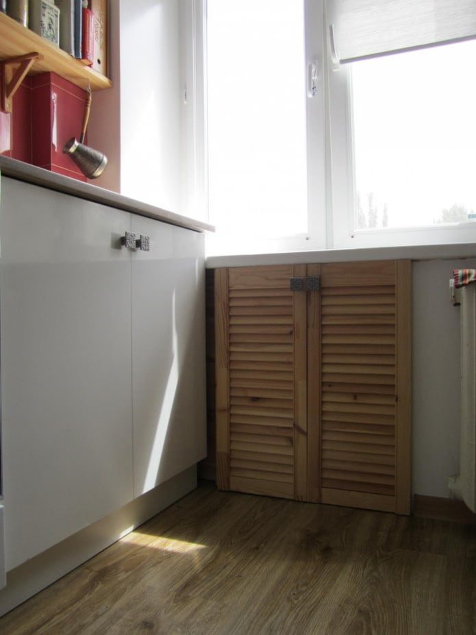 Кухня в хрущевке — отдельная тема для обсуждения. Только правильно все распланировав, здесь можно разместить все необходимое. Задействован должен быть каждый сантиметр. Именно поэтому очень удивительно и непонятно, когда владельцы крошечных кухонь не используют место под окном. На самом же деле, под подоконником можно сделать вместительный шкаф, установить технику, в том числе и холодильник и даже сделать это место частью кухонного гарнитура.