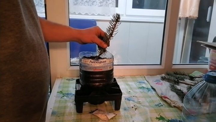 Для полива, который необходимо проводить два-три раза в неделю, нужно просто открутить крышку и с помощью пульверизатора хорошо опрыскать хвою. Внутри мини-парника всегда должно быть влажно — вы должны видеть конденсат на стенках. Такой уход необходим черенкам в течение 2-3 месяцев, пока идёт укоренение.