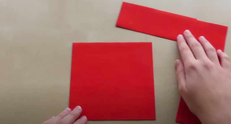 Для елочки нам понадобятся 2 салфетки. Каждую из них разворачиваем до прямоугольника и разрезаем на 2 квадрата, всего должно получиться 4 квадрата. На первом этапе нам потребуются только 2 из них.