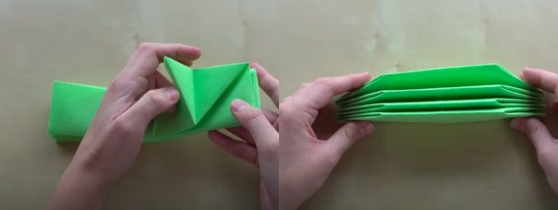 Ориентируясь на сгибы, которые уже есть на салфетке, складываем все плотной гармошкой с шагом в половину секции, чередуя верхнюю и нижнюю стороны.