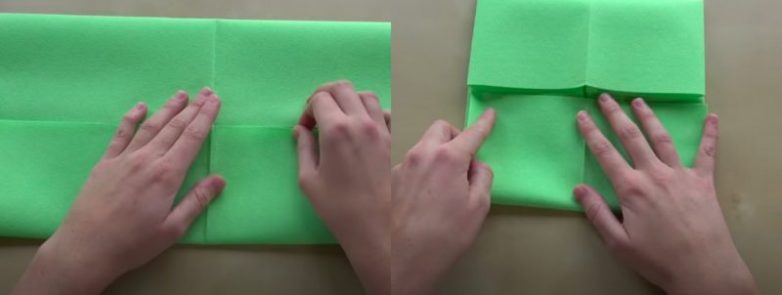 Полностью разворачиваем салфетку, а затем складываем ее, подгибая оба края в центр. В результате у вас должен получиться вот такой прямоугольник. Далее складываем противоположные края снова пополам в центр. Должен получиться уже квадрат.