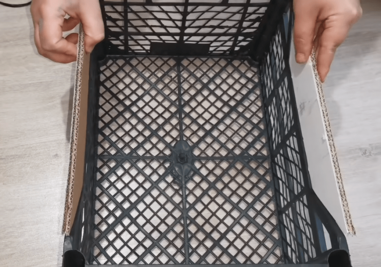 Положив ящик на бок, обводим его со стороны технических отверстий. Вырезав нужное количество деталей, склеиваем их между собой, чтобы набрать нужную толщину стенок.