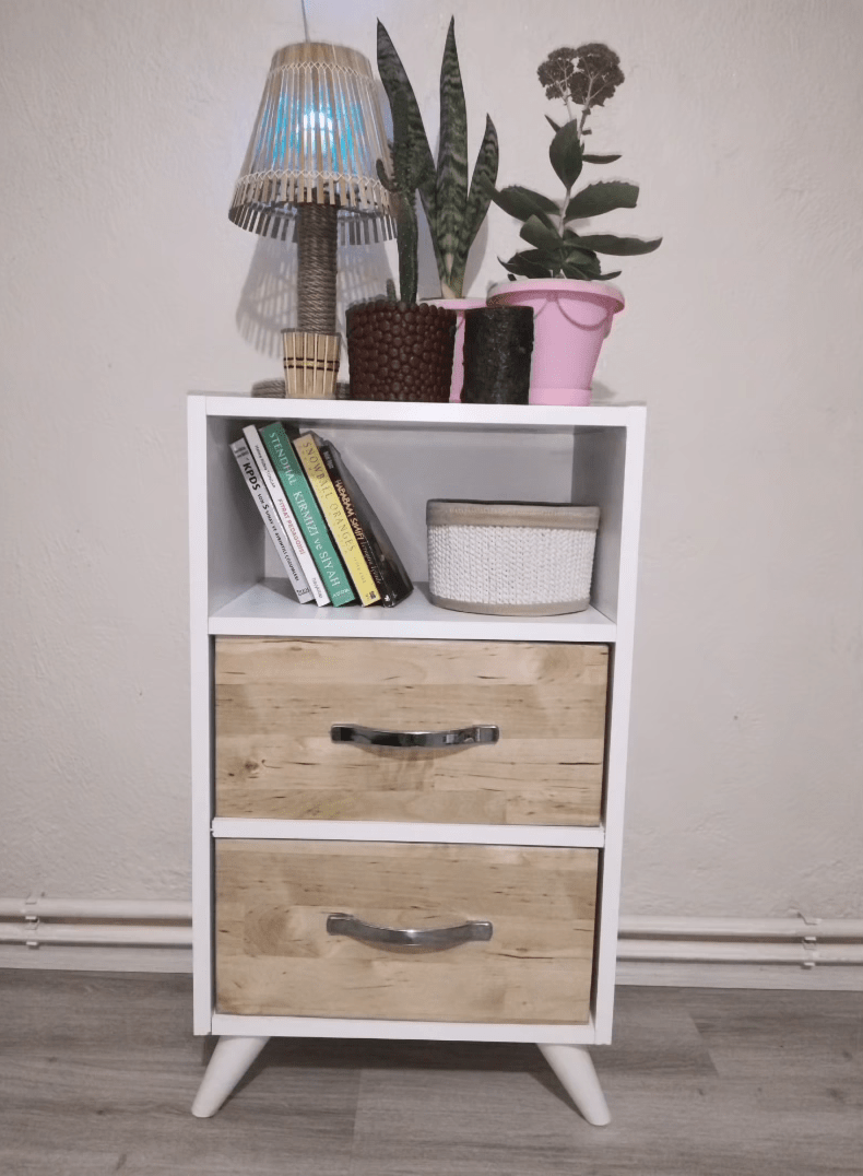Оклеиваем ящики подходящей самоклейкой, а затем дополняем ручками. По желанию внутри ящики также можно обклеить или задрапировать тканью. Дальше останется лишь определить, где будет стоять тумба и заполнить ее.