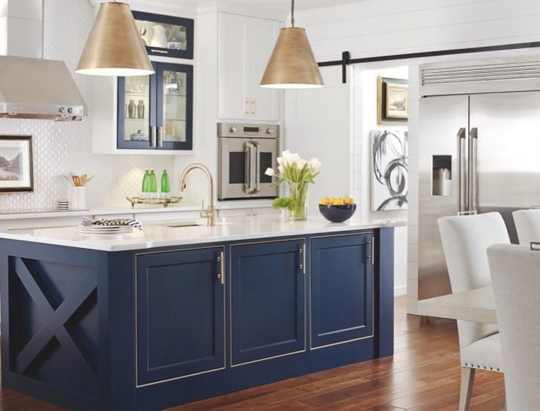 И на смену полностью белым шкафчикам приходят цветные. Ярко-красные, темно-синие и желтые элементы появляются в кухонных гарнитурах. Только выбирать нужно будет не больше двух ярких элементов, используя яркие дверцы у верхних или нижних шкафчиков.