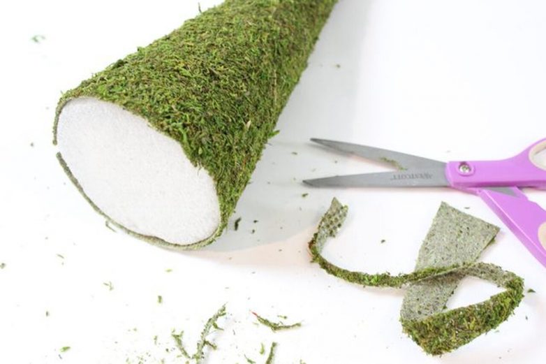 Оберните пенопластовый конус листом мха, приклейте его с помощью горячего клея.