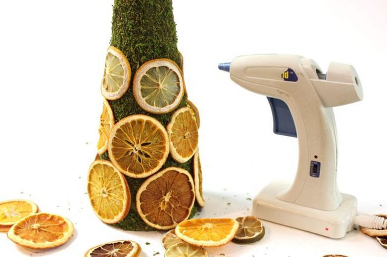 С помощью горячего пистолета прикрепите сухофрукты вокруг конуса. Клеить нужно снизу вверх, по одному ряду. Внизу располагайте большие кусочки, вверху — помельче.