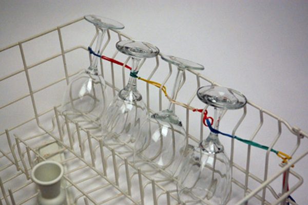 Чтобы бокалы не разбились во время мытья в посудомоечной машине, просто закрепите их на решетке канцелярскими резинками