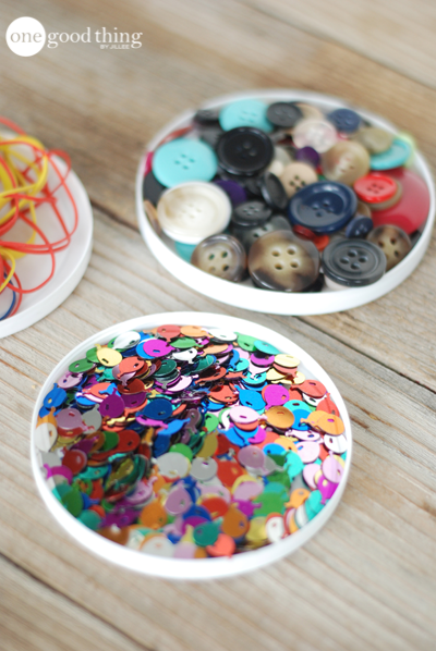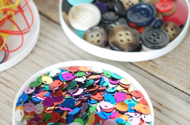 В крышках удобно хранить мелкие детали, когда вы занимаетесь творчеством: бусины, блестки, пуговицы, кнопки и т. д.