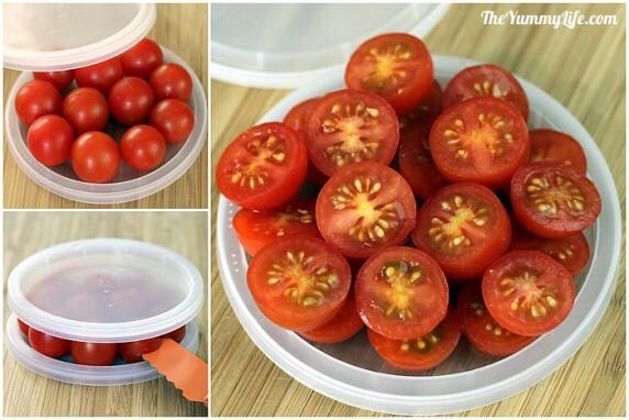 Чтобы быстро разрезать виноград или черри томаты на половинки, положите их между двумя пластиковыми крышками, слегка прижмите и пройдитесь острым ножом между ними.