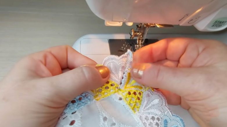 Во второй идее к ткани нужно аккуратно пришить оборку. Для этого на уголке складываем аккуратно кружево и продолжаем прошивать вторую сторону.