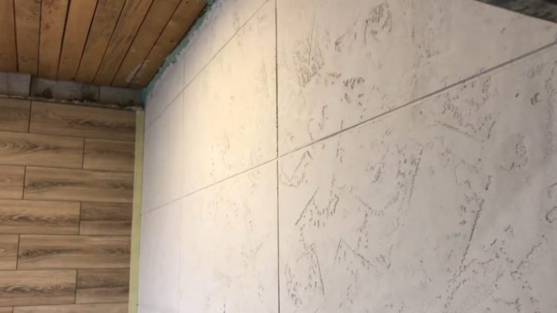 Имитация плитки делается на основе гипсовой штукатурки. Её нужно развести до консистенции густой сметаны. Нанести шпателем на стену сверху-вниз. Слой — 3-5 мм.
