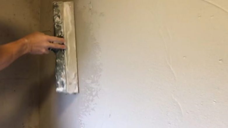 После этого взять металлическую кельму, прижать к штукатурке и отпустить. Получится интересный узор. Далее нужно немного подождать, чтобы штукатурка слегка подсохла и не прилипала к шпателю. Через 10 минут шпатель смочить водой и выровнять поверхность.