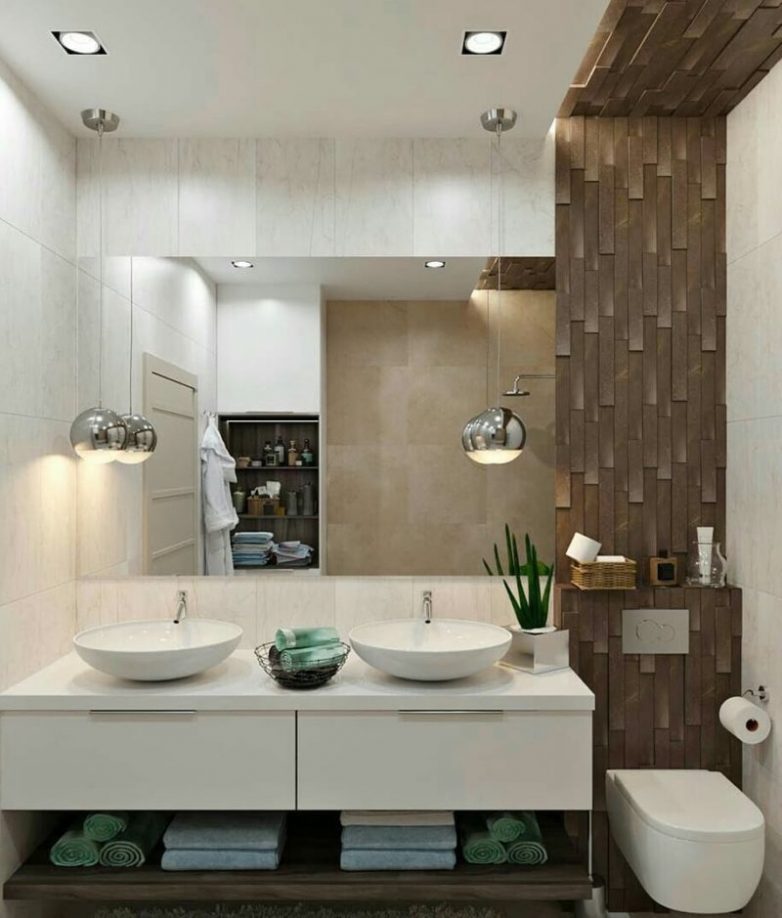 Глянцевые и зеркальные поверхности отражают свет, визуально расширяя пространство — используйте этот трюк в маленькой ванной