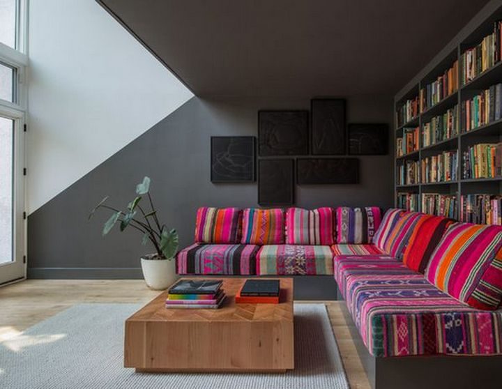 Очень интересный эффект даёт диагональ, расположенная на одной из стен. Удивительно, но создающийся за счёт такой графики оптический эффект сильно увеличивает пространство, в том числе и над головой.