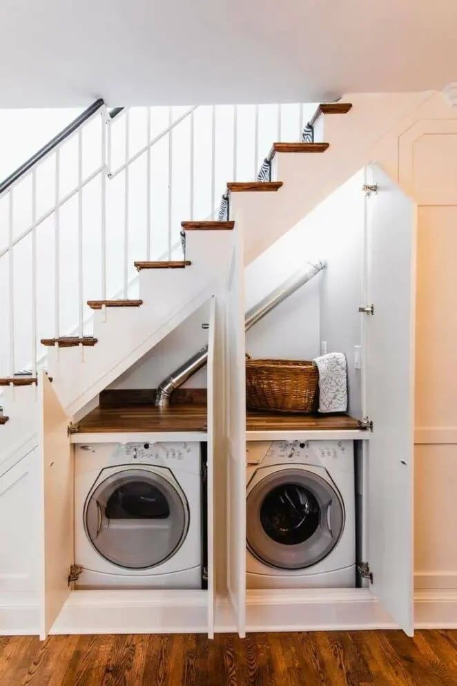 В двухэтажных частных домах небольшую прачечную можно организовать под лестницей за дверцей