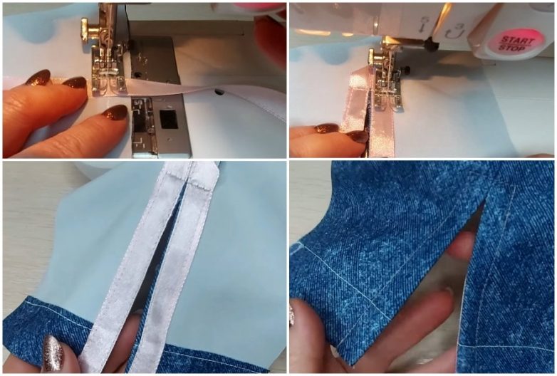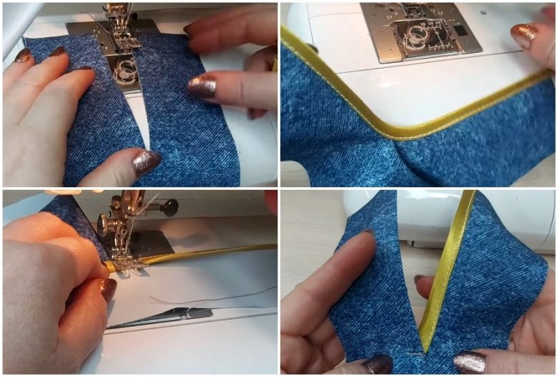 Для обычного разреза подойдет внутренняя окантовка. Суть работы заключается в том, чтобы разместить и закрепить ленту поперек полотна непосредственно над разрезом, а затем сделать надсечки на ткани до самого шва. Дальше остается разложить ткань так, чтобы разрез оказался посредине, загнуть надрезанную ткань в стороны, наложить поверх нее ленту, предварительно загнув ее вниз, и проложить строчку. Дойдя до низу, ленту следует подогнуть так, чтобы ее край остался с изнанки.