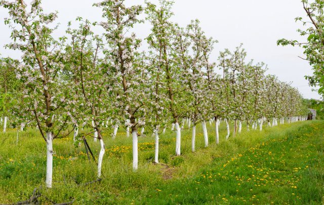 Побелка нужна деревьям для защиты от агрессивных солнечных лучей, перепадов температур во время оттепели и образования морозобоин. Поэтому время на эту процедуру лучше отвести осенью. Заняться побелкой стоит после листопада, когда дневная температура опустится до отметки 3°C. Можно использовать акриловую или водоэмульсионную краску белого цвета, а можно сделать состав самостоятельно.