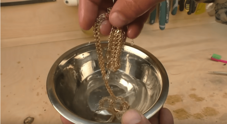 Опускаем в него украшения и оставляем их примерно минут на 5. Когда это время пройдет, достаем украшения и аккуратно очищаем с помощью мягкой зубной щетки. После чистки щеткой вновь отправляем украшения в чистящий раствор, но теперь минут на 20.
