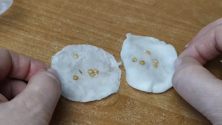 Далее, положите семена в ватный диск или заверните в марлю.