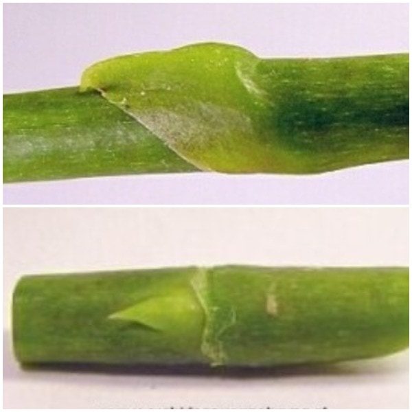 Обрежьте цветонос примерно на 3 см выше и ниже спящей почки. При помощи любого инструмента аккуратно снимаем покрывающую спящую почку чешуйку. Делать это надо очень осторожно, не повредив саму почку.