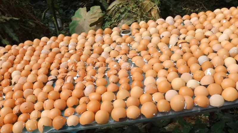 Яичная скорлупа — как известно, богатый источник органического кальция (90 %), а также фосфора, фтора, меди, железа и многих других. Прежде всего, скорлупу необходимо подготовить — тщательно промыть и просушить в течение 6 часов. Затем есть несколько разных способов применения на огороде. Первый — жидкое удобрение. Растолчённую скорлупу (от 2 яиц) залить чистой водой в литровой банке, оставить на 7 дней в тёмном месте. Затем полить удобрением любые культуры. Также сверху можно присыпать оставшейся на дне скорлупой.