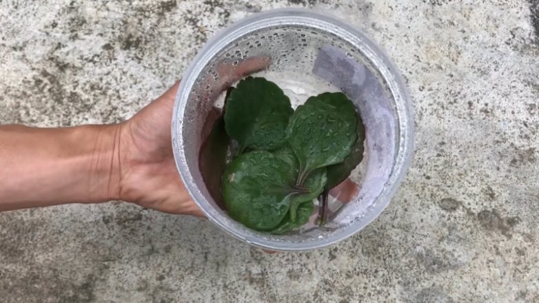 Поместите в высокую ёмкость с крышкой (например, чистый пластиковый стакан из-под сметаны). Внутрь положите листья. Смочите из пульверизатора.