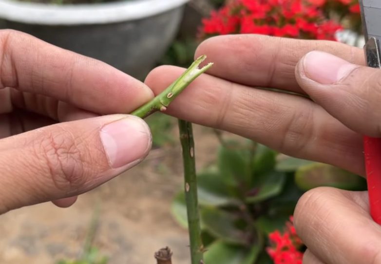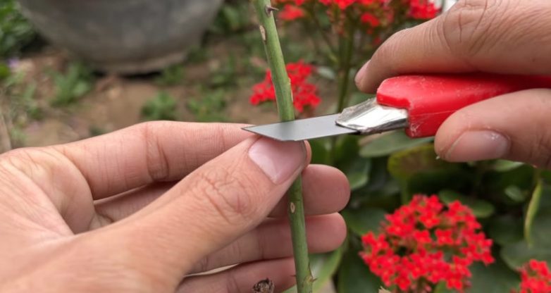 Прививка роз — очень простой процесс. Главное — использовать для работы стерильный инструмент. Используя острый канцелярский нож, срежьте стебель розы.