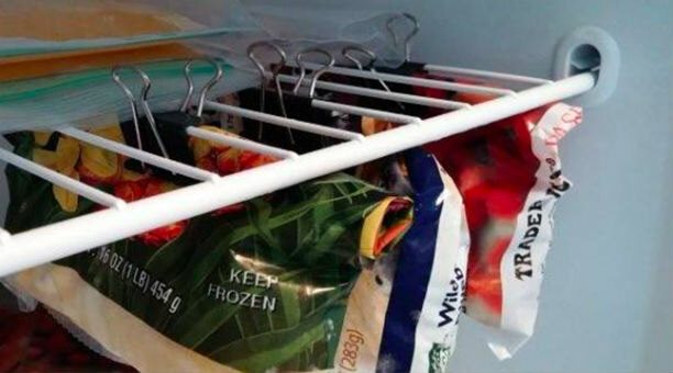 Просто закрепите железные прищепки-блиндеры на решетке морозилки. Вуаля, у вас есть второй ряд для подвешивания пакетов с заморозкой.