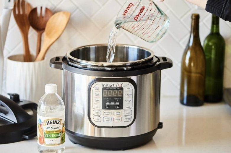 Для быстрой очистки силиконового кольца понадобится два стакана уксуса или воды с соком лимона. Налейте жидкость в чашу и включите режим «приготовление на пару» на несколько минут