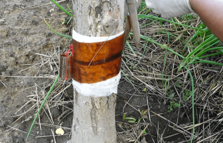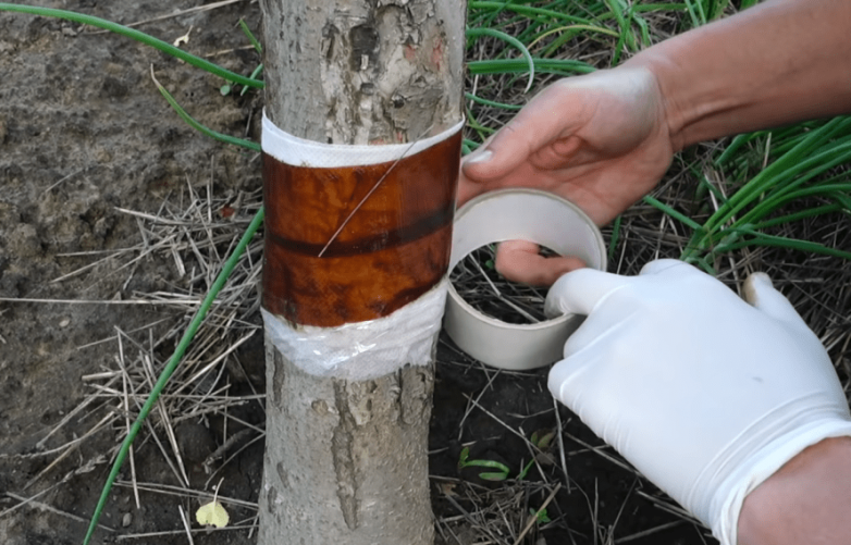 Второй частью ловушки станет обычная липучка для мух. Работать с ней лучше в перчатках. Задача заключается в том, чтобы наложить поверх тканевой повязки пару витков липучки, сделав отступы от края. Излишки ленты можно использовать для следующих деревьев. Примечательно и то, что такая повязка остается функциональной даже после нескольких дождей.