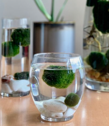 Маримо – это шаровидное водное растение родом из Японии. Благодаря удивительной сферической форме и пушистости водоросль может стать изюминкой интерьера. Растение неприхотливо, ему нужна фильтрованная вода и солнечный свет. Растет медленно, на 5 мм в год. Поэтому зеленый шар не потребует пересадок и замены вазы на больший размер.