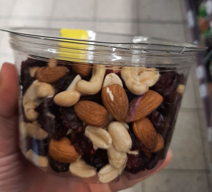 Это довольно популярный снек: очень вкусно, выглядит эстетично, к тому же дарит уверенность в том, что вы не перекусываете чем придется. Однако если внимательно рассмотреть состав пакетика, то можно увидеть, что основную массу в нем составляют цукаты, дешевый арахис и изюм. А вот более дорогих орехов вроде миндаля или кешью содержится очень мало.