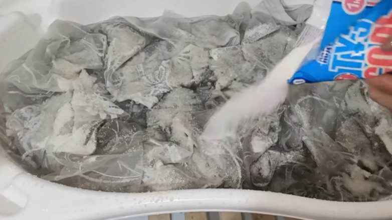 В большом тазу или детской ванночке замочите тюль в тёплой воде. Сверху высыпьте 1 кг обычной поваренной соли.